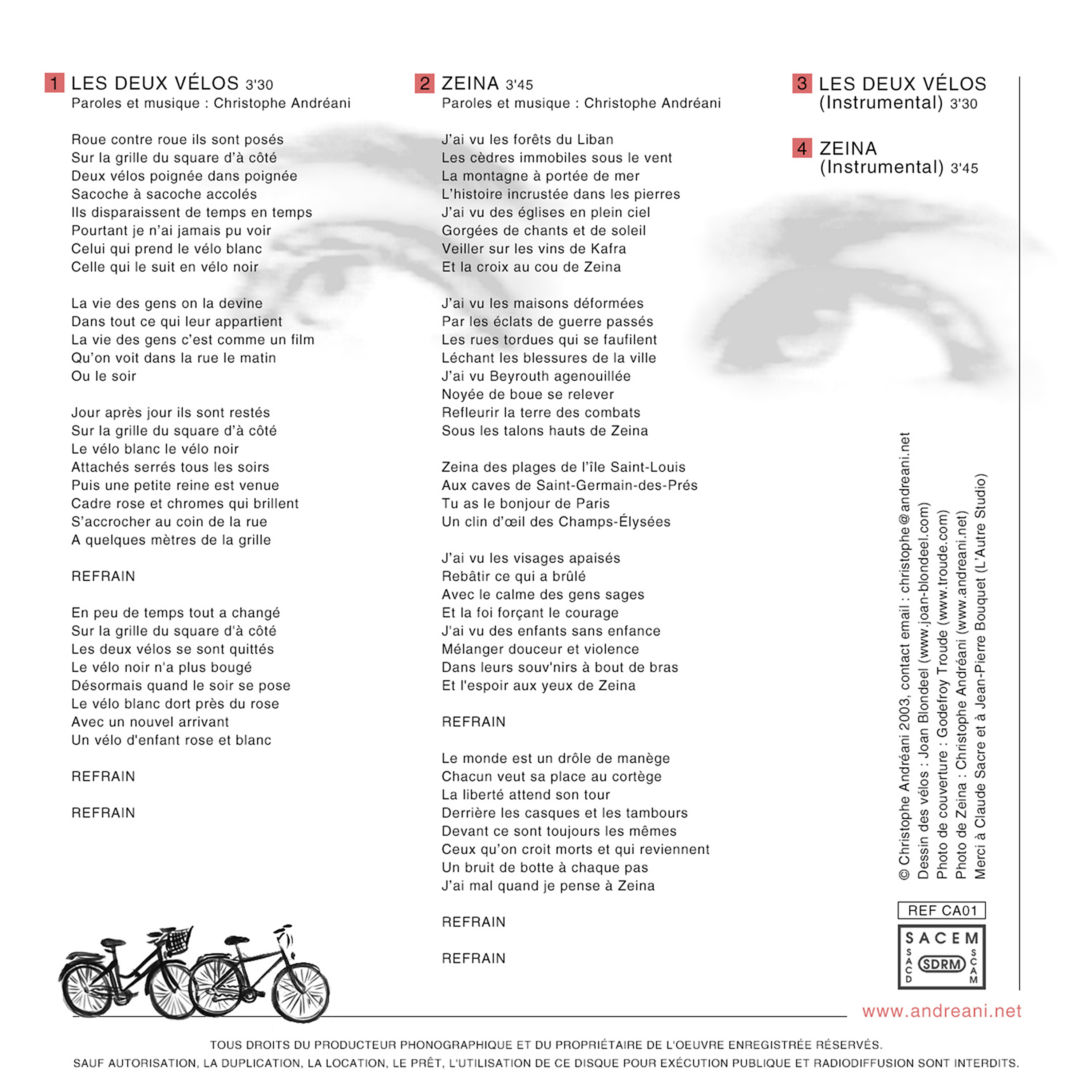 SINGLE "LES DEUX VELOS / ZEINA" (2012) Écouter le single sur les réseaux Écouter le single sur les plateformes de streaming Écouter le single sur YouTube (accès libre) Paroles et accords Les deux vélos Zeina Press Kit Pochette single recto Pochette single verso Photo 1 Photo 2